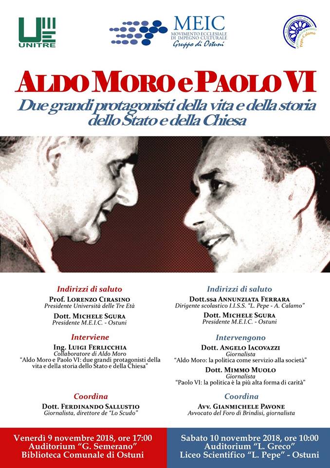 Sabato 10 novembre, alle ore 10, presso l’auditorium del Liceo Scientifico “Pepe” si terrà un ulteriore incontro dedicato alle due figure. Dopo gli indirizzi di saluto della dirigente scolastica Annunziata Ferrara e di Michele Sgura, a intervenire saranno due giornalisti: Angelo Iacovazzi, che parlerà di Aldo Moro e Mimmo Muolo che delineerà invece la figura di Papa Paolo VI. A moderare il dibattito sarà Gianmichele Pavone.