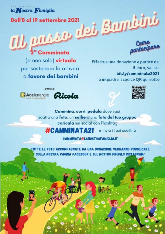 Torna la Camminata de La Nostra Famiglia per sostenere le attività riabilitative e di ricerca dei 28 centri sparsi sul territorio nazionale. Anche quest’anno in modalità virtuale, l’niziativa solidale dedicata ai bambini con disabilità è aperta a tutti e si terrà a partire da domani fino al 19 settembre in qualsiasi località d’Italia e del mondo.