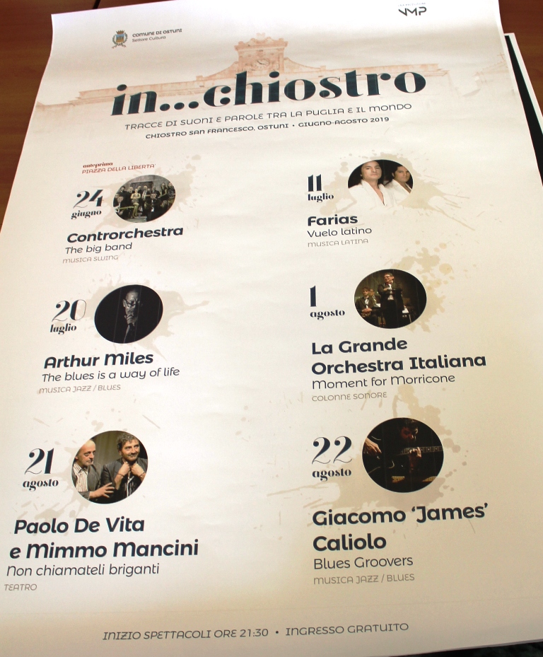 L’estate ostunese entra nel vivo con la prima edizione della rassegna musicale e teatrale “In… chiostro”, presentata alla stampa dal sindaco Guglielmo Cavallo e dal dirigente dell’Ufficio Cultura, Giovanni Quartulli, durante la conferenza tenutasi ieri, mercoledì 19 giugno.