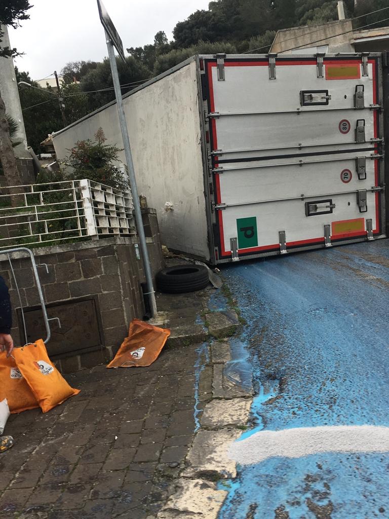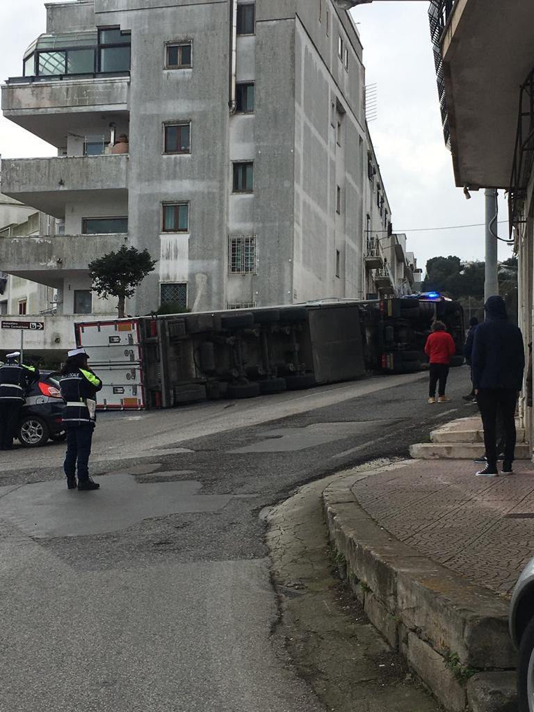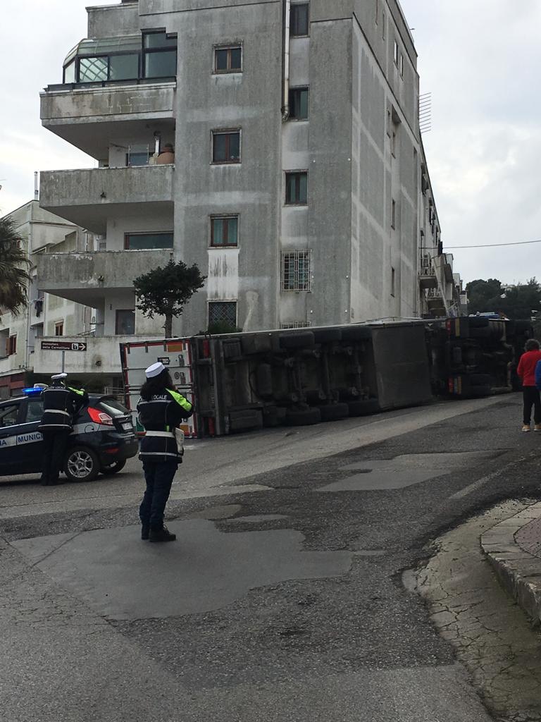 L’autista di un autoarticolato che trasportava detergenti, per cause ancora da verificare, ha perso il controllo dell’automezzo che si è ribaltato alla fine della strada panoramica, nei pressi dello svincolo di corso Mazzini.