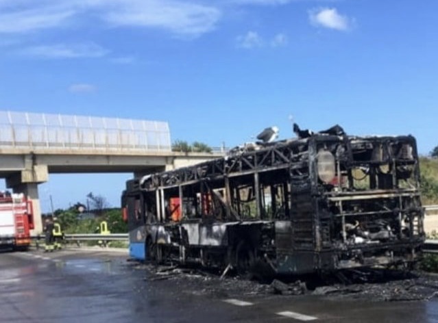L’autobus, immatricolato dodici anni fa e destinato al trasporto pubblico, è andato a fuoco nel giro di pochi minuti, finendo totalmente carbonizzato.