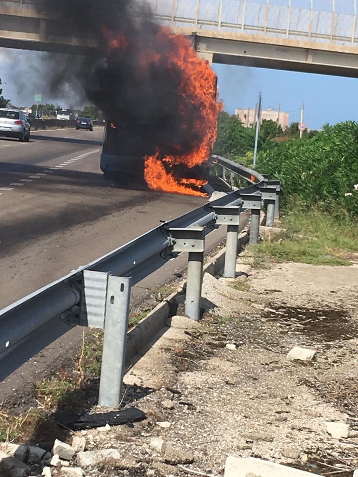 Un autobus della Stp è andato in fiamme questa mattina, poco dopo mezzogiorno, mentre percorreva la Strada Statale 379 in direzione Bari.