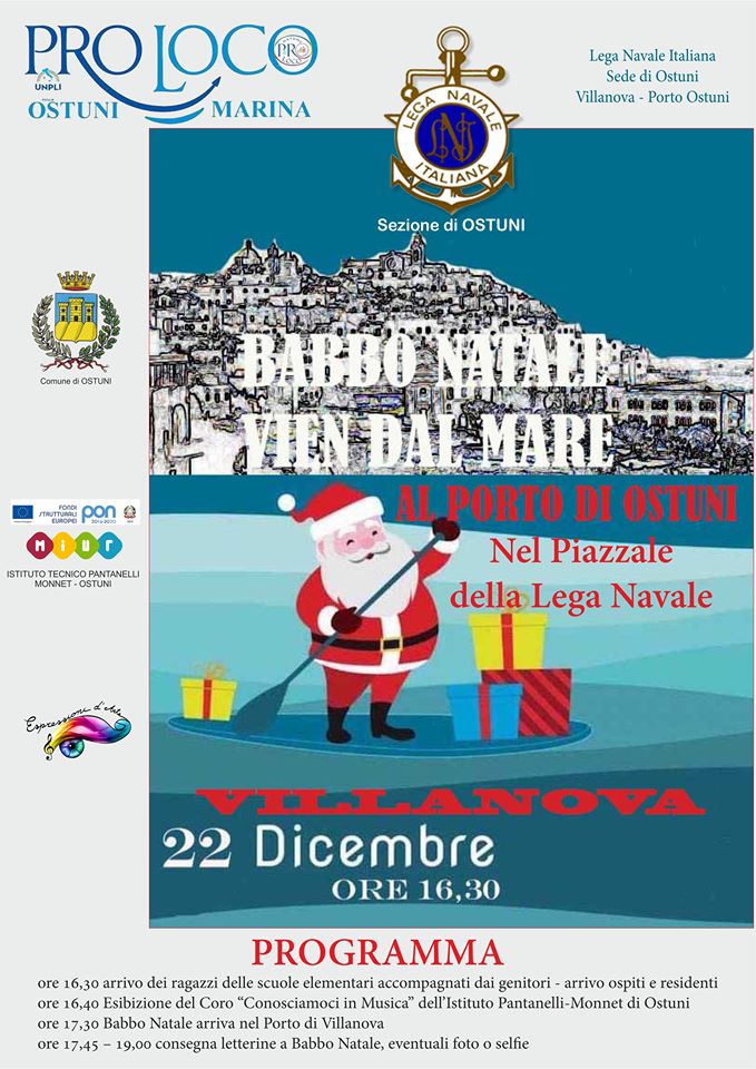 «Nello splendido scenario del Porto di Villanova – spiegano Domenico Greco e Agostino Carparelli, Presidenti rispettivamente di Pro Loco Ostuni Marina e Lega Navale di Ostuni – Babbo Natale arriverà dal mare per la gioia dei più piccoli e non solo. Si tratta della raffigurazione del famoso Babbo Natale che a bordo di una barca addobbata e illuminata per l’occasione, attraccherà presso la banchina della sede della Lega Navale di Ostuni. Allo sbarco assisteranno bambini e adulti che accoglieranno Babbo Natale con suoni e canti natalizi. Babbo Natale distribuirà ai presenti delle caramelle e si renderà disponibile a farsi fotografare insieme ai bambini che gli consegneranno le letterine.