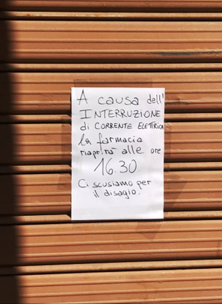 I negozi coinvolti, tra cui una farmacia, hanno poi riaperto alle 17, quando è stata ripristinata la fornitura da parte di Enel. Attraverso il servizio clienti contattato da più di qualche commerciante, la società ha riferito che l’intervento tecnico alla rete era stato programmato da tempo e comunicato all’utenza con le modalità consuete.