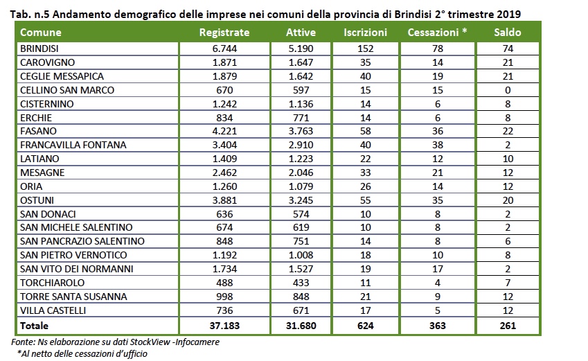 I dati relativi al secondo trimestre 2019 segnalano che in provincia di Brindisi sono 37.183 le imprese registrate, di cui 31.680 attive. Rispetto allo stesso periodo dell’anno scorso il saldo è in positivo di ben 261 unità, frutto delle 624 nuove iscrizioni alla Camera di Commercio e delle 363 contestuali cessazioni, registrando un incremento pari allo 0,71% rispetto all’anno scorso.