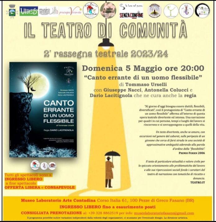 Quindicesimo appuntamento con la rassegna del “Teatro di Comunità” al MuLab di Pezze di Greco in corso Italia 61, dove domenica 5 maggio alle 20.00, sarà in scena “Canto errante di un uomo flessibile” di Tommaso Urselli, già vincitore del premio Fersen alcuni anni fa.