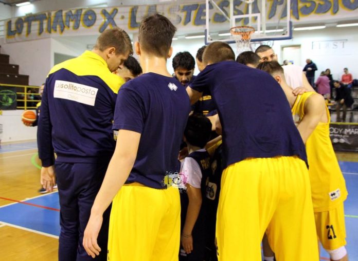 In una prima metà di gara non certo all’insegna dello spettacolo (26 pari all’intervallo), la Cestistica era riuscita a metà nel suo intento: grande applicazione difensiva nel riuscire a non far prendere fiducia ai biancorossi, ma anche poco smalto in attacco, con il solo Scarponi a tirare la carretta. Nel terzo quarto invece è stata la squadra di coach Putignano a cercare di dare la prima spallata: due bombe di Maksimovic, una del solito Scarponi e 4 punti consecutivi di Rotundo, i gialloblù chiudono il terzo quarto sul +6 (42-48).