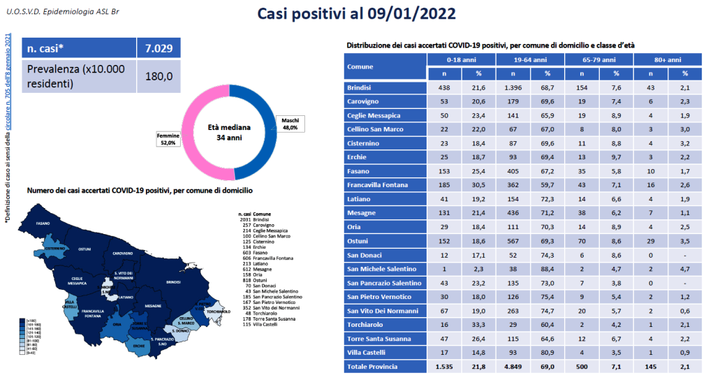 Nel brindisino il numero dei contagi continua a salire vertiginosamente, come si evince dall’aggiornamento settimanale dei dati sull’emergenza sanitaria. L’ultimo report a cura dell’Unità operativa di Epidemiologia del Dipartimento di Prevenzione della Asl di Brindisi, elaborato su fonte dati Sorveglianza integrata dei casi di Coronavirus Covid-19 in Italia – Istituto Superiore di Sanità, evidenzia che alla data del 9 gennaio 2022 risultano positivi 7.029 soggetti, il 48% uomini e il 52% donne, con età media di 34 anni. I positivi sono così suddivisi per fasce di età: 1.535 nella fascia 0-18 anni, 4.849 tra 19-64 anni, 500 tra 65-79 anni, 145 negli 80 e oltre. L’ultimo aggiornamento sullo stato di salute degli attualmente positivi descrive il 77% dei soggetti asintomatici, il 19,5% paucisintomatici, il 3% con sintomatologia lieve, lo 0,4% severi e lo 0,1% critici.