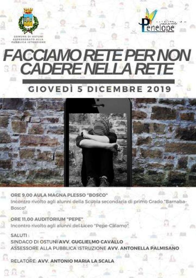 S’intitola “Facciamo rete per non cadere nella rete” la giornata contro il cyberbullismo organizzata dall’assessorato alla pubblica istruzione del Comune di Ostuni in collaborazione con Penelope Onlus, che prevede un doppio incontro degli studenti con l’avvocato Antonio La Scala. Alle ore 9 il famoso penalista di origini pugliesi, volto noto della trasmissione televisiva di Rai3 “Chi l’ha visto” incontrerà gli alunni della scuola “Barnaba – Bosco”, mentre alle ore 11 gli studenti del liceo “Pepe – Calamo”.