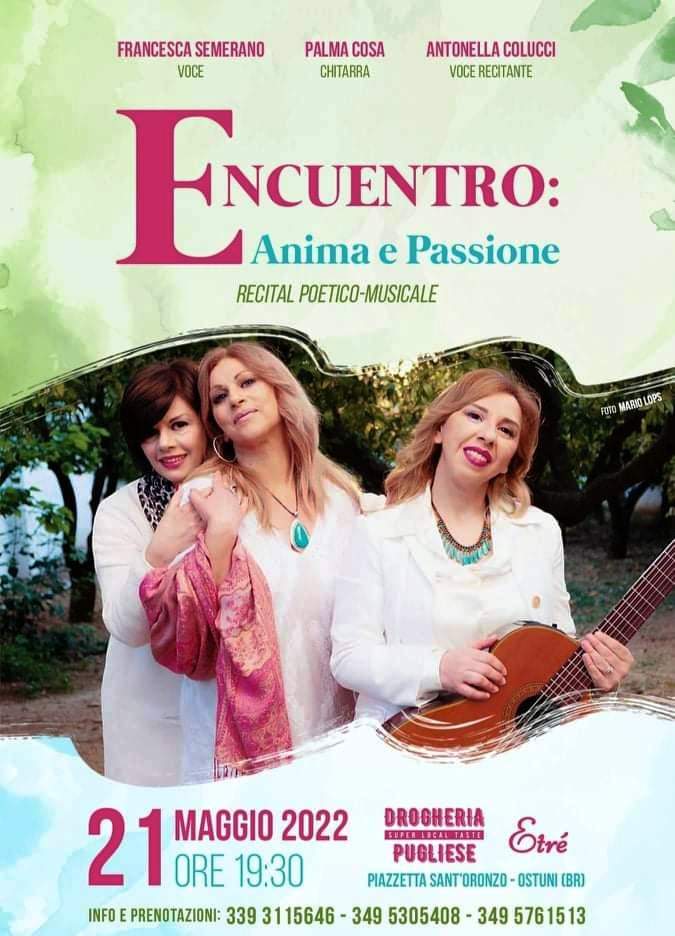 Riparte da Ostuni al tramonto di questa sera, sabato 21 maggio, alle ore 19.30 presso Drogheria Pugliese ed Etre’, in piazzetta Sant’Oronzo, “Encuentro: Anima e Passione “, recital poetico- musicale, nato nel 2018 dall’incontro di tre donne: Antonella Colucci, Francesca Semerano e Palma Cosa, accomunate dall’amore per il Sud America, che ben si collega in varie sfumature ed emozioni al nostro Sud, alle nostre radici.