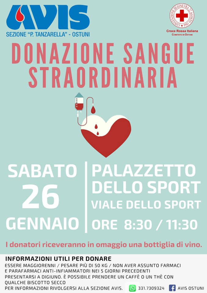 Ancora un’iniziativa promossa dall’Avis di Ostuni, che ha organizzato per sabato 26 gennaio una raccolta di sangue straordinaria.