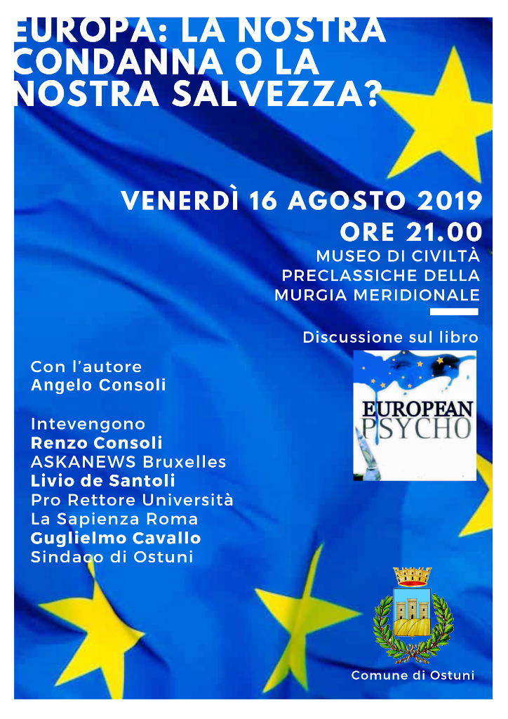 L’Europa rappresenta una minaccia o una opportunità per i cittadini e le comunità locali? Se ne discuterà domani, venerdì 16 agosto, alle ore 21 nel Museo di Civiltà Preclassiche della Murgia Meridionale, durante la presentazione del libro European Psycho introdotta e moderata dal sindaco Guglielmo Cavallo.