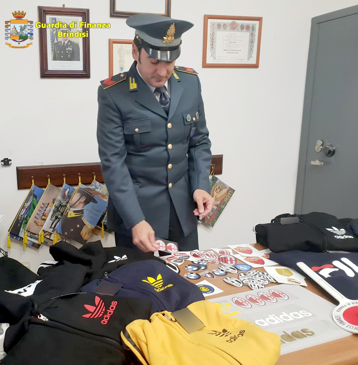 I marchi contraffatti riguardavano marche note quali Levis’, Adidas, Fila e capi contenenti i loghi di squadre di calcio come Milan, Inter, Juventus, Napoli, Torino, Real Madrid. All’interno del locale sono stati rinvenuti sia i macchinari utilizzati per la contraffazione, che numerosi capi di abbigliamento già confezionati e pronti per essere immessi sul mercato parallelo.
