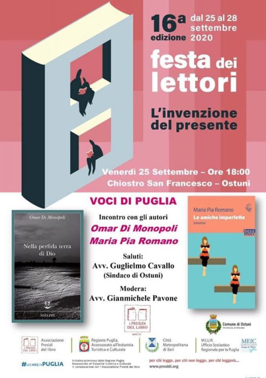 Come di consueto, nel mese di settembre l’associazione organizza eventi culturali per celebrare la Festa dei lettori e quest’anno non fa eccezione. Paola Cirasino, responsabile del Presidio del Libro di Ostuni, insieme al gruppo di volontari che lavorano al suo fianco, organizza un singolare incontro a due voci con gli autori Omar di Monopoli e Maria Pia Romano, autori rispettivamente di “Nella perfida terra di Dio” e “Le amiche imperfette”.