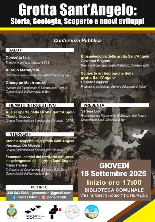 La conferenza è aperta a tutta la cittadinanza e rappresenta un momento di incontro e confronto sul valore del patrimonio carsico pugliese, con particolare attenzione agli studi più recenti condotti sulla Grotta Sant’Angelo.