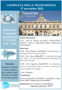 Organizzato dalla Segreteria generale del Comune di Ostuni, l’evento costituisce un’importante occasione per affrontare in modalità interattiva i temi della prevenzione della corruzione e degli obblighi in materia di pubblicazione e accessibilità.