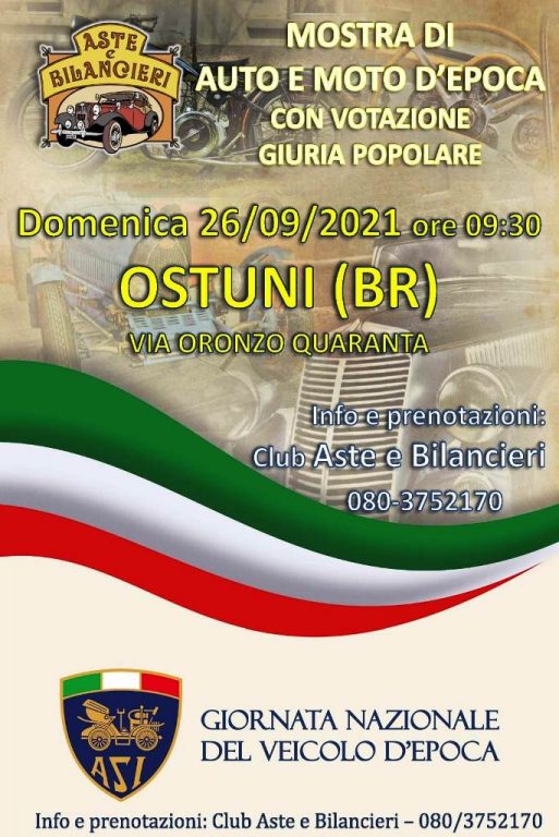Per l’edizione 2021, che vedrà puntualmente riunirsi su tutte le più importanti piazze d’Italia tantissimi appassionati possessori di auto e moto d’epoca, l’associazione “Aste e Bilancieri” ha scelto Ostuni, la Città Bianca, dove alle ore 9,30 si daranno appuntamento tutti i partecipanti dando vita ad una mostra statica dei loro veicoli.