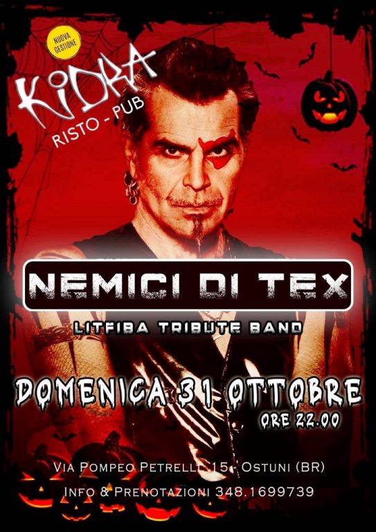 La fiamma del rock si accende nella notte di Halloween al Kidra Risto Pub di Ostuni, con un concerto “da paura”. Vietato annoiarsi a partire dalle ore 22 di domenica 31 ottobre, quando avrà inizio il live dei “NeMiCi Di Tex”, tribute band dei Litfiba tra le più acclamate del Sud Italia, nata a Santeramo in Colle nel 2009. Ciò che contraddistingue la band sin dagli esordi è lo straordinario impatto sul pubblico, sempre numeroso e sempre pronto a cantare a squarciagola tutto il repertorio.