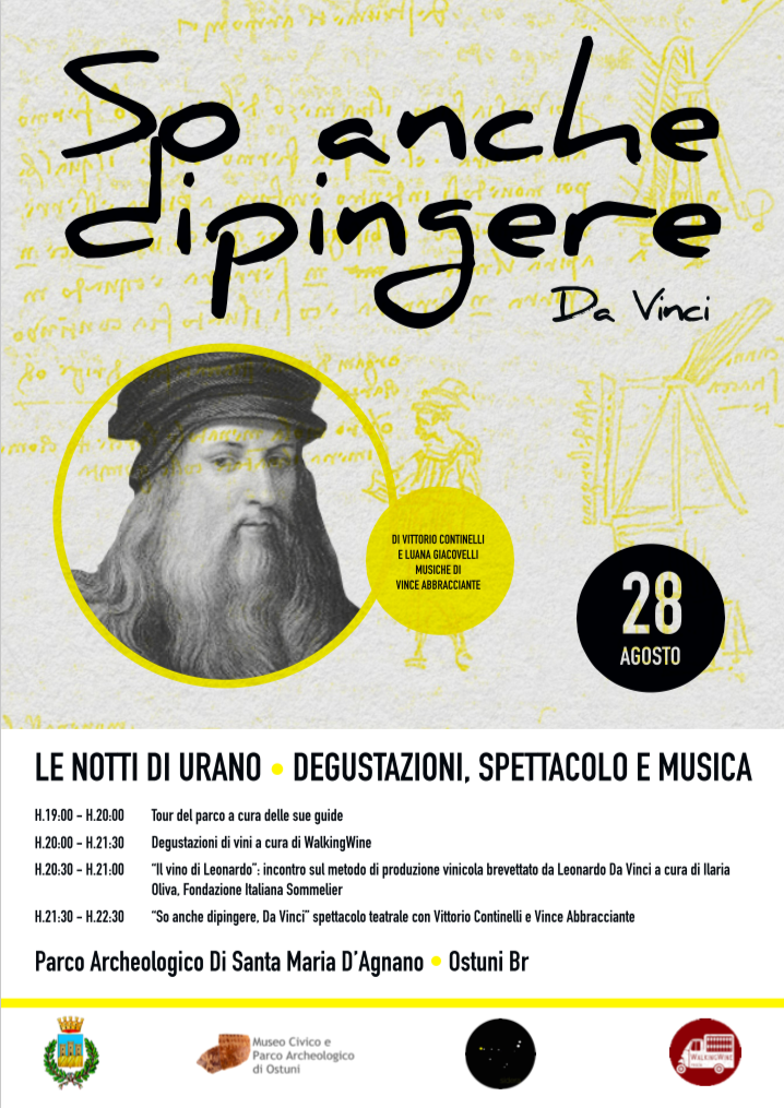 Volge al termine la rassegna culturale “Le Notti di Urano”, che questa sera si conclude con il terzo e ultimo appuntamento in calendario. Ideata dall’associazione culturale Sidera e organizzata in collaborazione con il Museo di Civiltà Preclassiche della Murgia Meridionale e Walking Wine, la rassegna che ha contribuito ad animare il Parco archeologico di Santa Maria di Agnano durante la stagione estiva si chiude alle ore 19 di oggi, mercoledì 28 agosto, con un affascinante evento dedicato interamente al talento e all’ingegno di Leonardo Da Vinci.