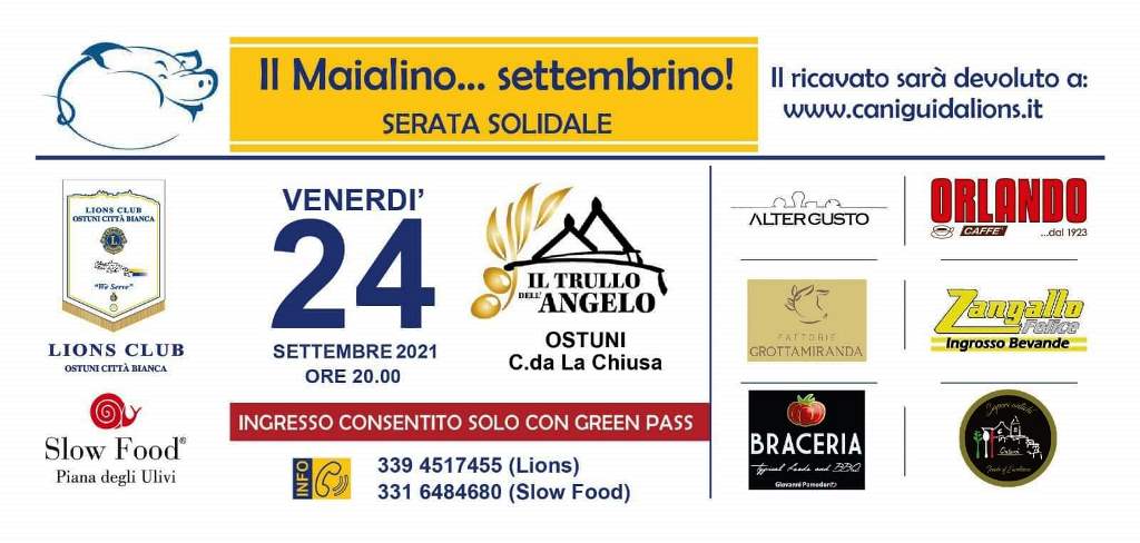 Ritorna domani, venerdi 24 settembre, alle ore 20, presso il Trullo dell’Angelo, “Il maialino settembrino”, l’immancabile evento autunnale del Lions Club Ostuni Città Bianca che, insieme alla Condotta Slow Food “Piana degli Ulivi“, si pone l’obiettivo di raccogliere fondi per addestrare e consegnare gratuitamente cani guida alle persone non vedenti.