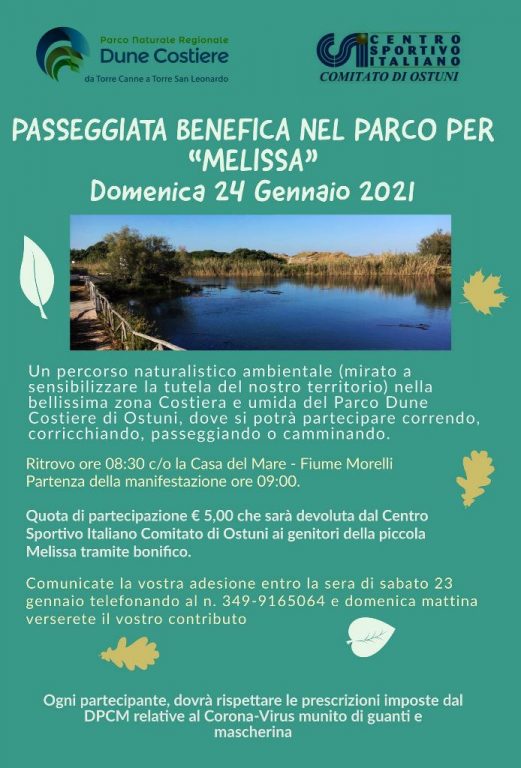 Il ritrovo è previsto alle ore 8,30 presso la Casa del Mare, situata nell’area umida di Fiume Morelli, mentre la partenza della manifestazione è fissata alle ore 9. La quota di partecipazione è di 5 euro, che sarà interamente devoluta dal Centro Sportivo Italiano Comitato di Ostuni ai genitori della piccola Melissa. Si raccomanda il massimo rispetto delle disposizioni anti covid che prevedono l’uso di mascherine obbligatorie, di gel disinfettante e il mantenimento di una distanza minima di due metri. L’organizzazione consiglia di indossare abbigliamento comodo / sportivo e di portare con sé una bottiglietta d’acqua.
