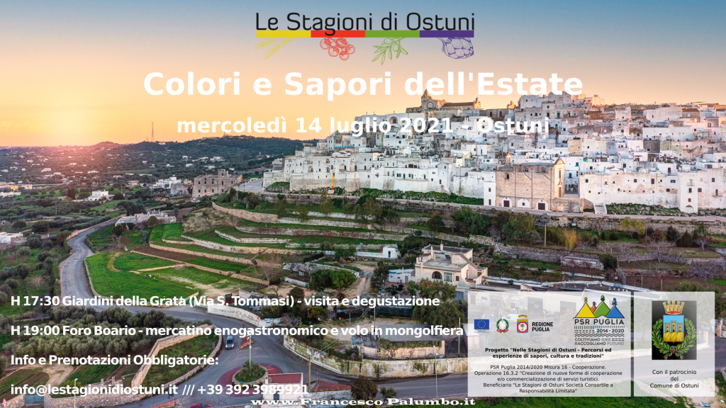 Si terrà domani, mercoledì 14 luglio, a partire dalle ore 17.30, l’evento “Colori e Sapori dell’Estate” che avrà inizio con l’accoglienza dei partecipanti presso i Giardini della Grata (Via Salvatore Tommasi – Ostuni) e con la presentazione del progetto. Seguirà una degustazione di prodotti enogastronomici tipici estivi e una visita guidata agli Orti medievali posti a ridosso delle antiche mura di difesa. Alle ore 19 è prevista l’apertura del mercatino enogastronomico presso il Foro Boario che, per l’occasione, ospiterà una mongolfiera.
