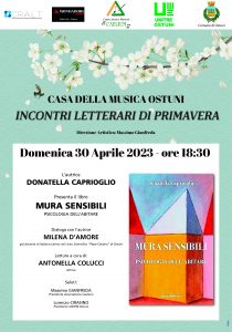 Domenica 30 Aprile alle ore 18.30, presso la Casa della Musica di Ostuni, si terrà il secondo appuntamento di “Incontri Letterari di primavera”, una rassegna di arte poetica e letteraria promossa dal Centro Artistico Musicale Caelium di Ceglie Messapica.