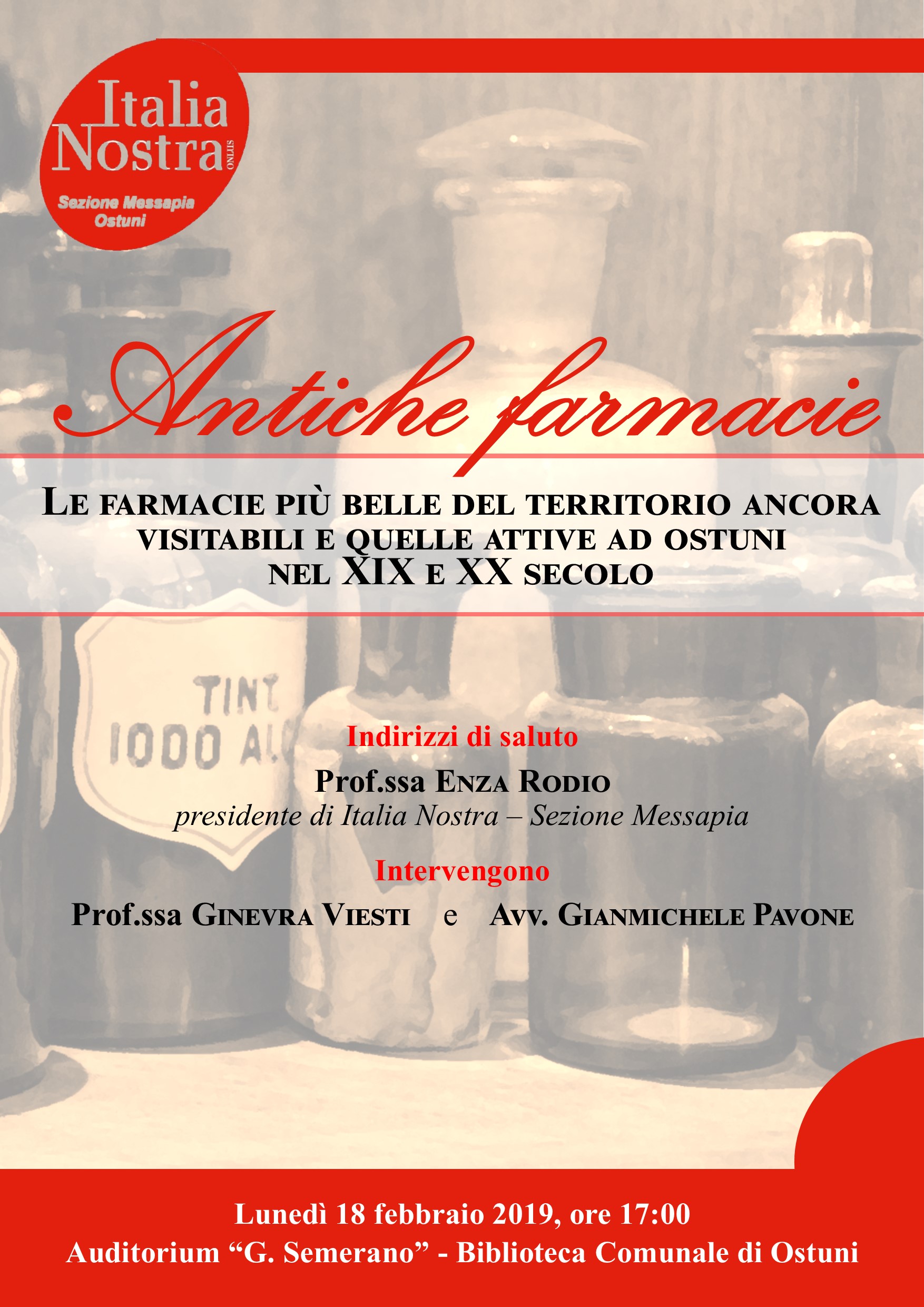 L’incontro, dal titolo “Antiche Farmacie“, è inserito nell’assemblea della Associazione “Italia Nostra- Sezione Messapia ” e sarà introdotto dalla presidente Enza Rodio e successivamente sviluppato da Ginevra Viesti e Gianmichele Pavone.