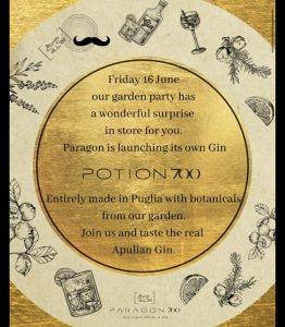 Basandosi sulla popolarità del distillato, e sul suo gusto deciso ed unico, l’Hotel Paragon 700 ha deciso di lanciare il suo Gin Potion 700, un gin pugliese fatto su misura con ingredienti biologici a Km 0 provenienti dal giardino del Paragon stesso che sarà presentato venerdì 16 giugno alle 19:00 nel corso di una festa in giardino.