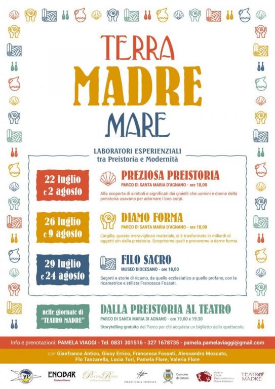 Il Parco di Santa Maria d’Agnano e le sue meraviglie archeologiche e naturalistiche raccontate attraverso un nuovo progetto di valorizzazione del territorio chiamato “Terra Madre Mare”. Organizzata dal Comune di Ostuni e dal Museo di Civiltà preclassiche della Murgia meridionale, la rassegna è stata ideata e promossa da Pamela Viaggi, EnoBar Enoteca Greco, Palazzo Rodio e Francesca Fossati. Sei in tutto gli eventi esperienziali in programma, che prevedono laboratori artistici e visite guidate nei tre spazi che compongono il principale polo culturale della Città bianca: il Museo civico, il Museo Diocesano e il Parco di Santa Maria d’Agnano.