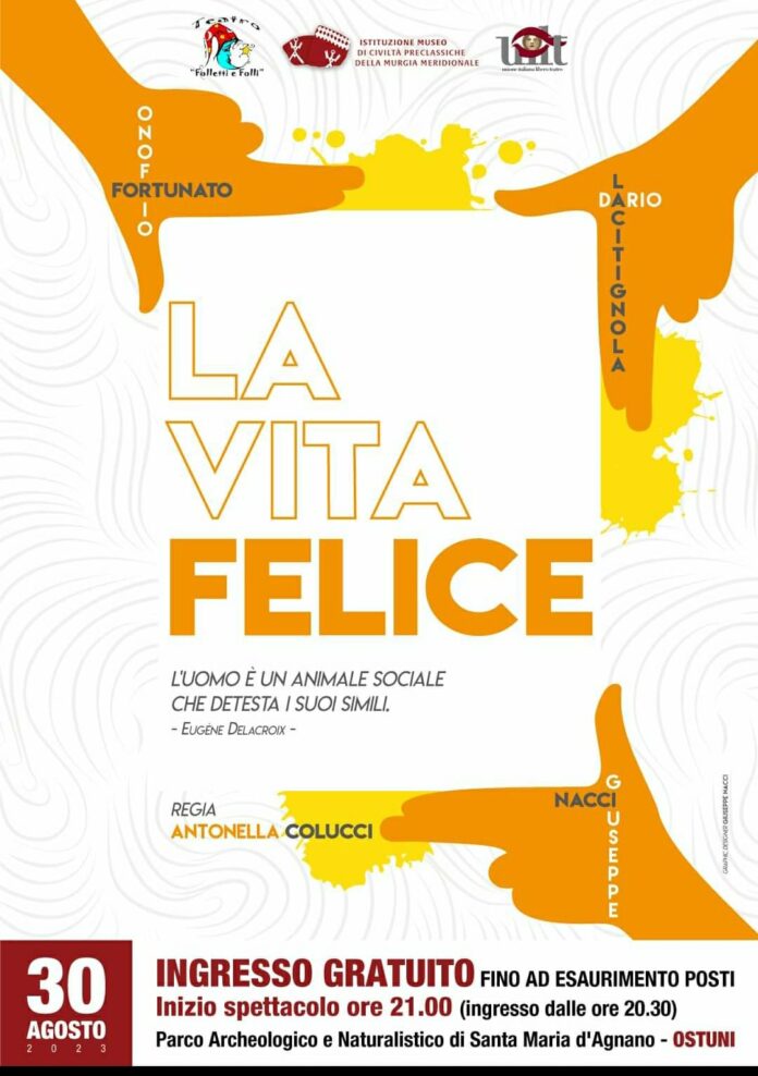 Presso il Parco Archeologico è Naturalistico di Santa Maria D’Agnano ad Ostuni sarà presentata stasera, Mercoledì 30 Agosto alle ore 21.00, la commedia semiseria in un atto. “LA VITA FELICE” .