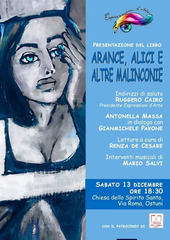 Sabato 13 dicembre nella Chiesa dello Spirito Santo ad Ostuni alle ore 18:30 sarà presentato il libro “Arance, alici e altre malinconie” (Gruppo Albatros Il Filo), di Antonella Massa, che dialogherà con Gianmichele Pavone.