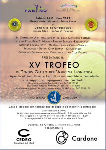 Il Torneo, organizzato in gare di doppio con formazione di coppie ed incontri a sorteggio, si svolgerà Sabato 15 Ottobre 2022 presso il Grand Hotel Masseria Santa Lucia di Ostuni – ove avrà luogo la semifinale – e Domenica 16 Ottobre 2022 presso il Tennis Club alla Selva di Fasano per l’attesissima finale, al termine della quale ci sarà la premiazione dei vincitori.
