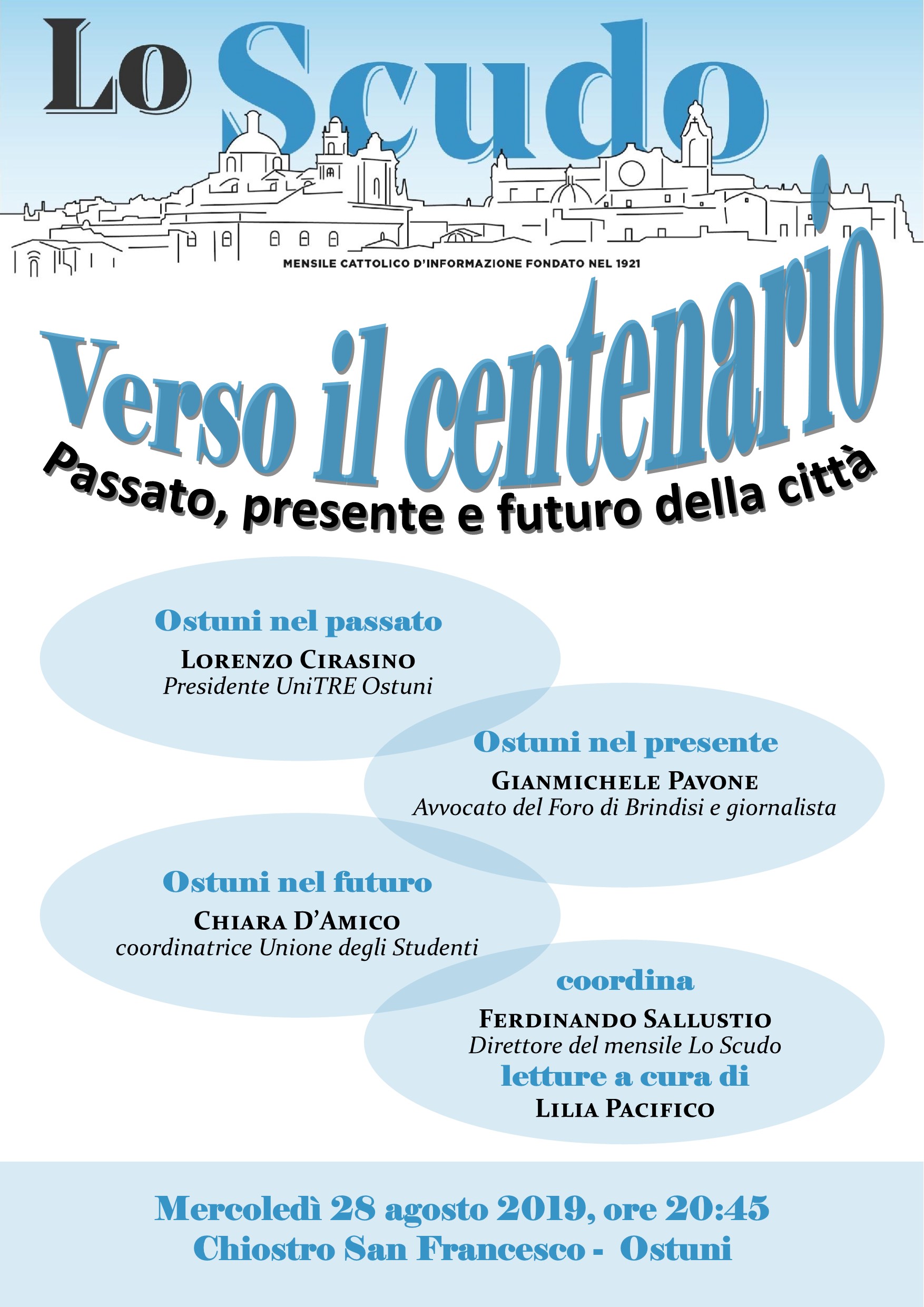 Si terrà alle ore 20.45 di oggi, mercoledì 28 agosto, presso il chiostro di Palazzo San Francesco, l’evento commemorativo che celebra i cento anni dello storico giornale cattolico ostunese. “Lo Scudo verso il centenario: passato, presente e futuro della città” è l’interessante serata organizzata dal giornale per sollecitare una riflessione a tutto campo sulla storia, lo sviluppo, i problemi e le sfide di Ostuni.