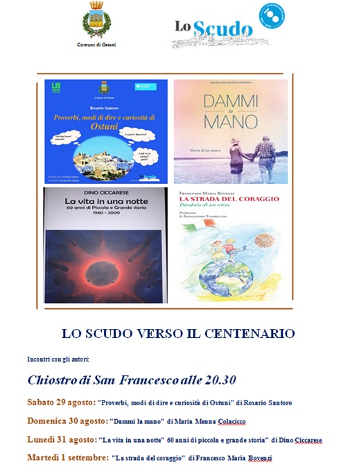 Quattro serate e quattro libri, il 29, 30 e 31 agosto e il 1° settembre, per “Lo Scudo“, il mensile cattolico ostunese che è entrato nel centesimo anno di pubblicazione ininterrotta. Fin dalle sue origini “Lo Scudo” ha sostenuto la lettura e l’interesse verso la poesia, la narrativa, la saggistica di autori locali, ma che molto spesso hanno respiro nazionale e resistono nel tempo.