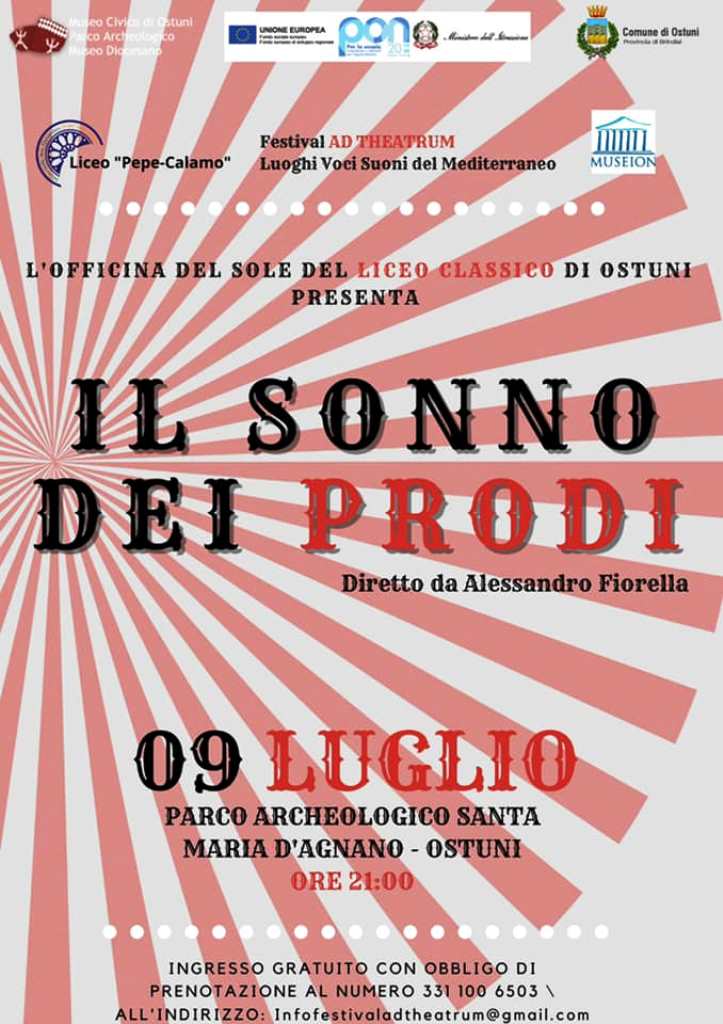 “Il sonno dei prodi”, diretto da Alessandro Fiorella, è il primo spettacolo in presenza dell’Officina del Sole ad andare in scena dopo la pandemia domani, venerdì 9 luglio, alle ore 21 presso il Parco archeologico e naturalistico di Santa Maria d’Agnano. Il gruppo teatrale della Sezione Classica del Liceo “Pepe-Calamo” di Ostuni, in realtà, non si è mai fermato, realizzando durante il periodo di emergenza sanitaria il cortometraggio “Pas de cirque”, che costituisce il prologo dell’attuale spettacolo. Di certo, però, il teatro in presenza, nello straordinario scenario dell’anfiteatro del Parco d’Agnano, consentirà di fruire pienamente della magia di questa forma d’arte.