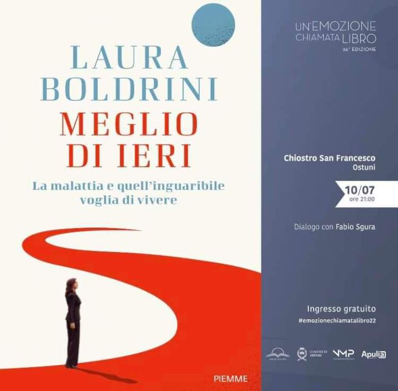 “Meglio di ieri, la malattia e quell’inguaribile voglia di vivere” (Piemme Edizioni) è il libro che la deputata presenterà al pubblico di Ostuni in cui racconta il cancro che l’ha colpita in pieno lockdown. Un tumore osseo, l’operazione, le settimane in ospedale e la successiva e dura riabilitazione, un’esperienza forte, che oggi la Boldrini condivide anche per dare sostegno a chi vive la stessa esperienza. Con molte riflessioni sulla sanità è un libro scritto con l’obiettivo di combattere i pregiudizi ancor oggi esistenti sulla malattia, che molti nascondono e fa invece parte della vita di tutti, uno sprone a combattere non solo il ‘nemico’ dentro di noi ma anche a contrastare i condizionamenti e le discriminazioni che mirano a trasformare quel nemico in una macchia indelebile.