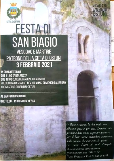 Mercoledì prossimo Ostuni celebrerà, come da tradizione, la festa di San Biagio, Patrono della Città bianca. L’amministrazione comunale e la Vicaria hanno messo a punto il programma che ripercorre le tappe di una tradizione antica, contribuendo a mantenere viva la devozione nei confronti del Santo, nonostante l’emergenza sanitaria in corso.