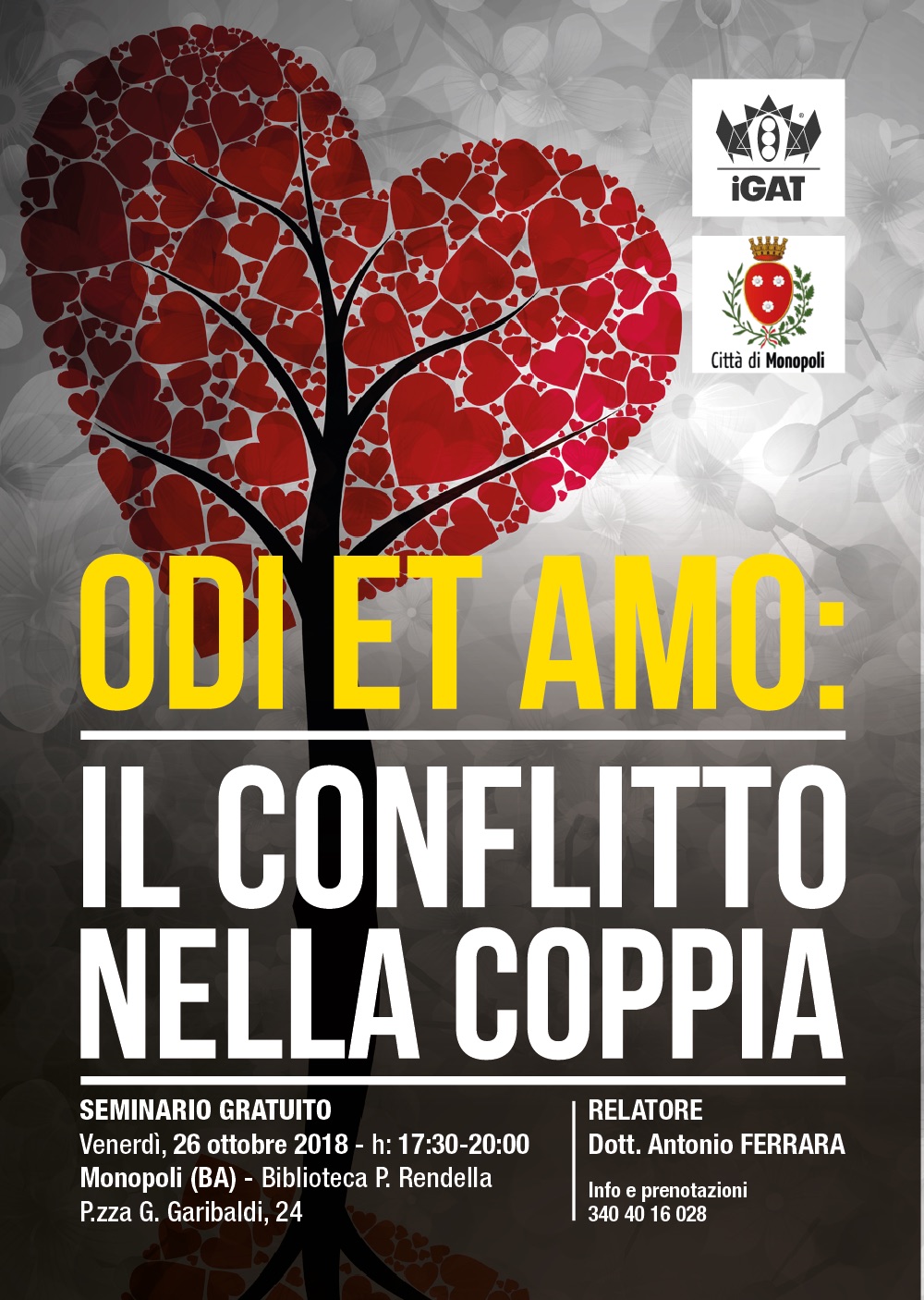 In occasione del Mese del Benessere Psicologico, venerdì 26 ottobre si svolgerà a Monopoli un Seminario gratuito tenuto dal dottor Antonio Ferrara, sul tema “Odi et Amo: il conflitto nella Coppia”.