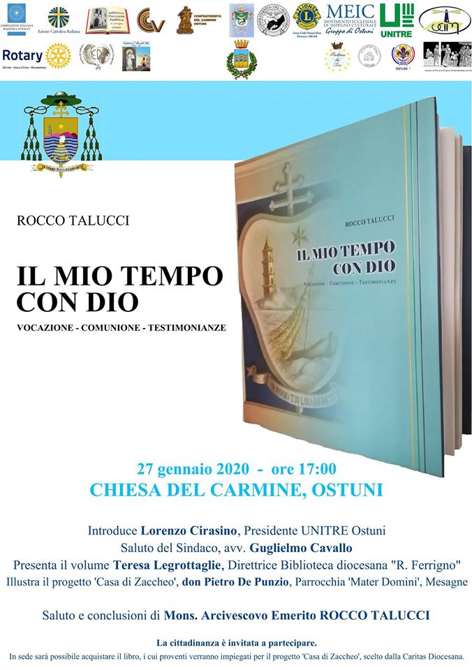 L’Arcivescovo emerito della diocesi Brindisi-Ostuni, Mons. Rocco Talucci, presenterà il suo libro “Il mio tempo con Dio” a Ostuni, domani lunedì 27 gennaio alle ore 17 presso la Chiesa della Madonna del Carmine. Nel volume Talucci racconta la sua esperienza come sacerdote e come vescovo prima a Tursi-Lagonegro (dal 1988 al 2000) e successivamente nella nostra diocesi (dal 2000 al 2013).