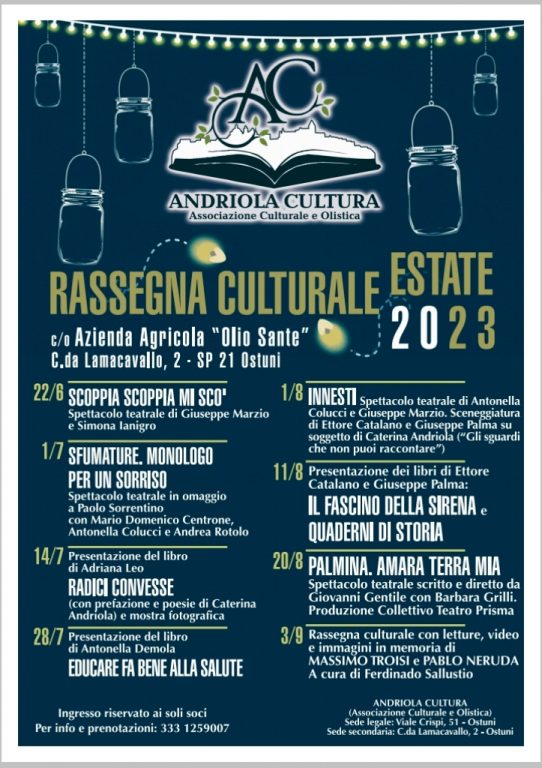 La scrittrice ostunese Caterina Andriola ha costituito nei giorni scorsi l’associazione culturale e olistica “Andriola Cultura“, che si occuperà principalmente della tutela, dello sviluppo e della promozione della cultura letteraria e teatrale in Ostuni, oltre che del benessere tout court della persona umana.