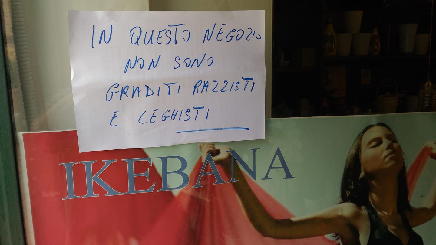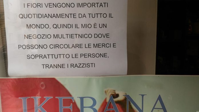 I fiori vengono importati quotidianamente da tutto il mondo, quindi il mio è un negozio multietnico dove possono circolare le merci e soprattutto le persone, tranne i razzisti”, così recita il cartello stampato affisso dinanzi ad “Ikebana”, l’attività commerciale di Emanuele Modugno.