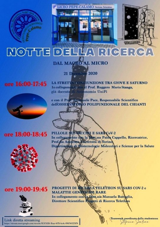 La sezione Scientifico del Liceo “Pepe-Calamo” della Città bianca invita la cittadinanza a partecipare virtualmente alla sua Notte della Ricerca, che si svolgerà a partire dalle ore 16 di oggi, lunedì 21 dicembre, in diretta streaming dall’aula di informatica dell’istituto.