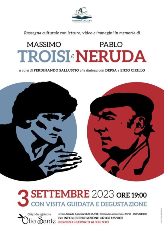 Caterina Andriola, naturopata, poetessa e scrittrice ostunese chiude questa estate con una serata in memoria di Massimo Troisi, a settant’anni dalla sua nascita e quasi trenta dalla sua morte avvenuta il 4 giugno 1994, e di Pablo Neruda, poeta e diplomatico cileno del Novecento e Premio Nobel per la Letteratura nel 1971, a cinquant’anni dalla sua morte avvenuta il 23 settembre 1973. Un connubio perfetto tra i due ripercorrendo tappe importanti della carriera dei due artisti.