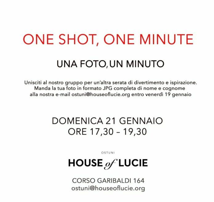 Ritorna domenica 21 Gennaio alle ore 17,30 il tanto atteso progetto “One Shot, One Minute” , finalizzato alla valorizzazione della fotografia singola alla House of Lucie Ostuni in corso Garibaldi 164 .