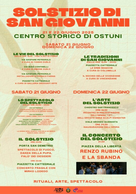 Il “Solstizio di San Giovanni”, organizzato da Puglia Culture e sostenuto dal Comune di Ostuni, si svolgerà sabato 21 e domenica 22 giugno 2025, trasformando il centro storico in un grande palcoscenico a cielo aperto. Due giorni intensi in cui la città si trasforma in uno spazio condiviso di visioni e incontri: tra installazioni d’arte, spettacoli di fuoco, performance circensi, concerti, riti della tradizione e momenti di riflessione dedicati all’ecologia e al cambiamento.
