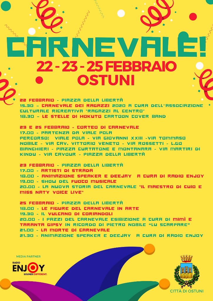Sarà una festa lunga tre giorni quella che Ostuni si appresta a vivere con l’arrivo del carnevale. Un programma ricco di eventi con sfilate di carri e gruppi mascherati, messo a punto dall’amministrazione comunale di Ostuni in collaborazione con Radio Enjoy.