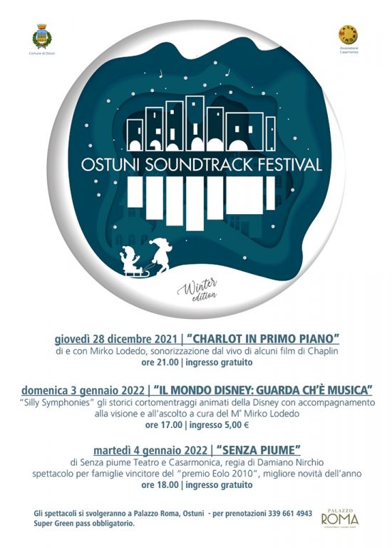 Il Comune di Ostuni, in collaborazione con l’Associazione Casarmonica, organizza quest’anno l’edizione invernale di “Ostuni Soundtrack Festival”, l’evento dedicato alle colonne sonore che hanno fatto la storia del Cinema mondiale, rivolgendo particolare attenzione a bambini e ragazzi.