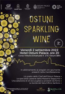 Terza edizione venerdì 2 settembre per l'”Ostuni Sparkling Wine“: un appassionante viaggio tra le eccellenze gastronomiche dell’Alto Salento della provincia di Brindisi ed il meglio degli spumanti di Puglia.
