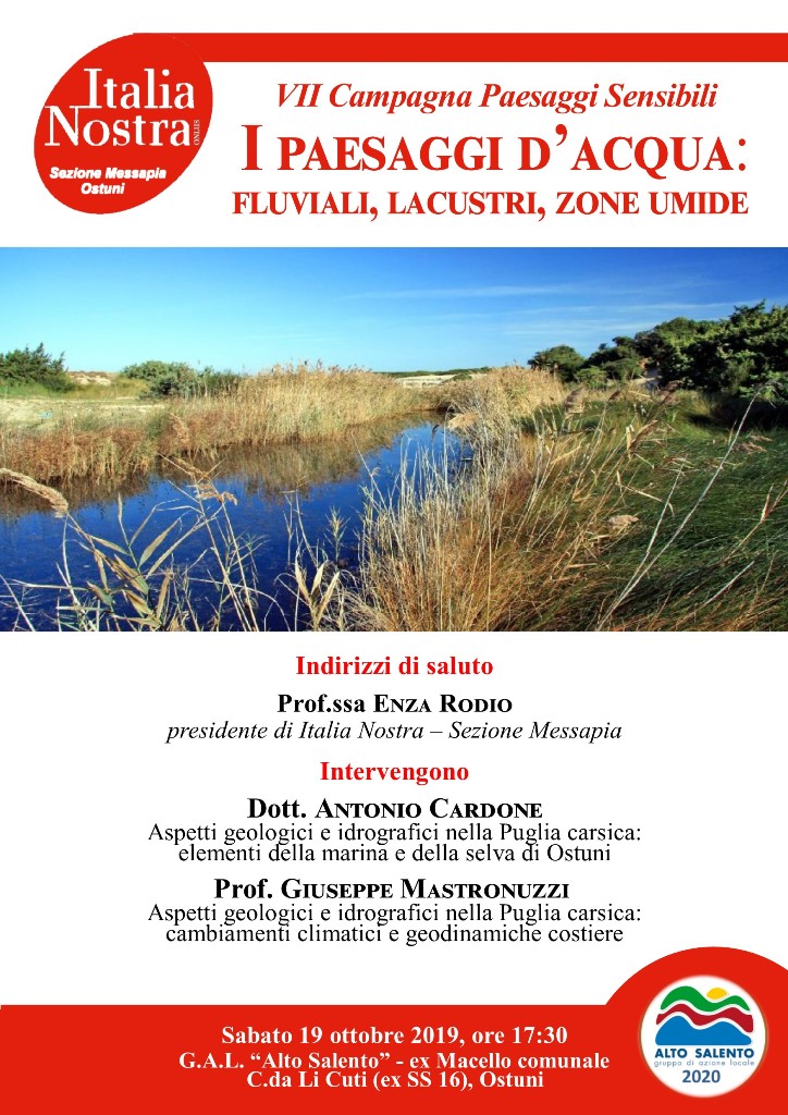 Si terrà presso l’ex macello cittadino e sede del GAL Alto Salento, alle ore 17.30 di oggi, sabato 19 ottobre, il convegno dedicato a “I paesaggi d’acqua: fluviali, lacustri, zone umide“. L’incontro, gratuito e aperto alla cittadinanza, è stato organizzato dalla sezione ostunese di Italia Nostra, in occasione della VII campagna nazionale dei Paesaggi sensibili.
